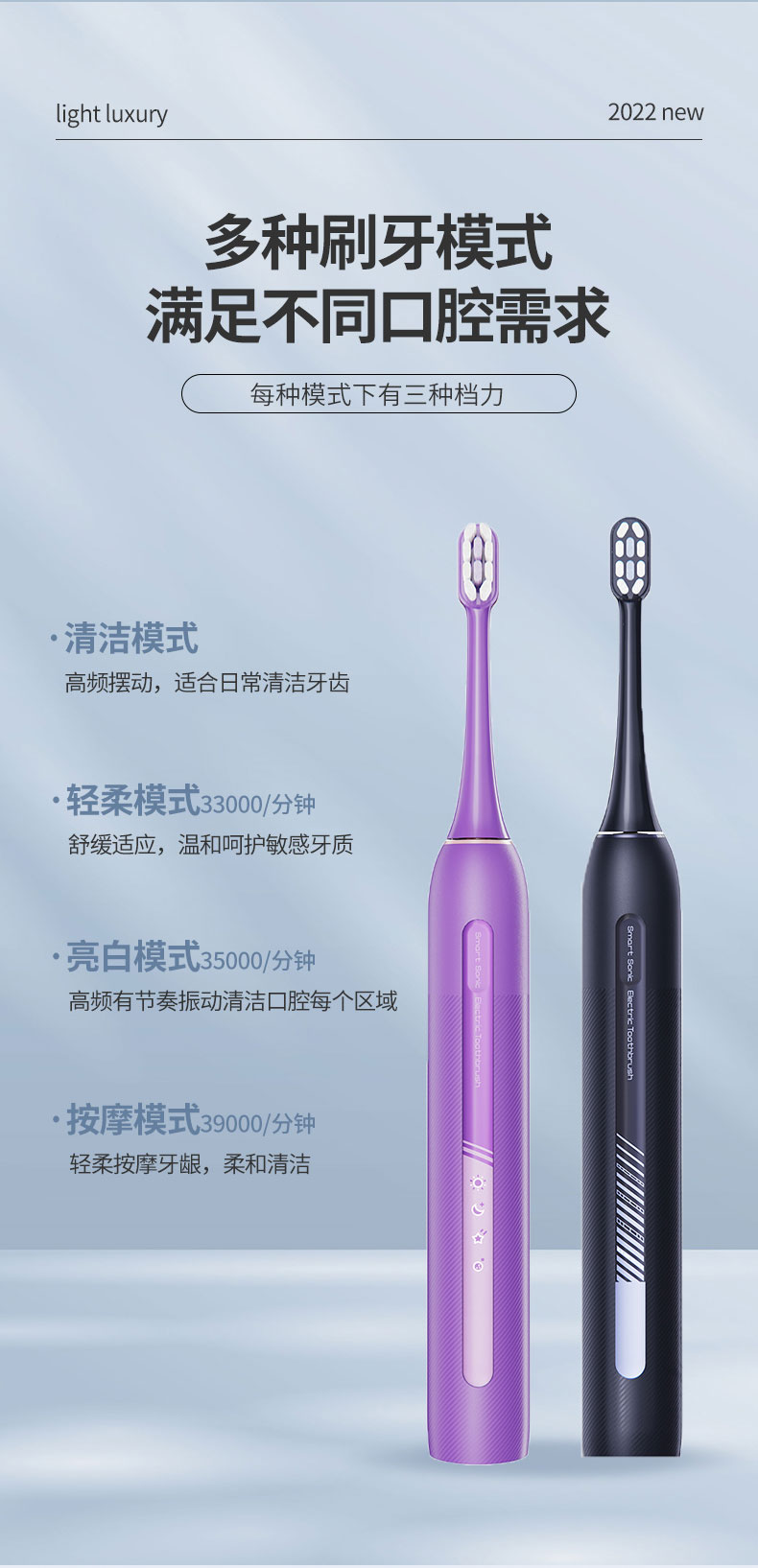 聲波口潔力新一代電動牙刷–刷博士【聲波感應(yīng)智能電動牙刷】是一款新研發(fā)創(chuàng)新的感應(yīng)式聲波電動牙刷,可實現(xiàn)“入口即開,離口即停”,告別按鍵的感應(yīng)黑科技。這款【聲波感應(yīng)電動牙刷】多種刷牙模式且每種模式下均有3檔力度調(diào)節(jié),可滿足不同口腔需求;USB直充,方便易攜帶,出差旅行收納省心;iPX7級防水全身可水下沖洗,沐浴使用也不怕,隨意浸泡,也滴水不入,給你十足安全感!